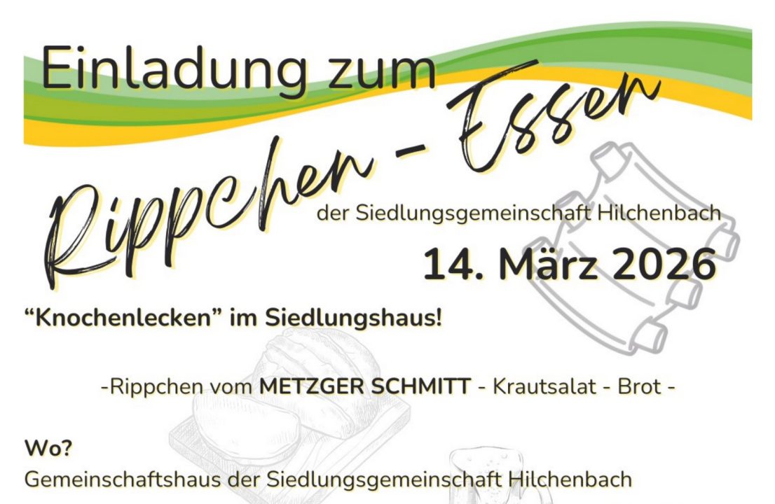 (wS/sgh) Hilchenbach 21.01.2026 | Die Siedlungsgemeinschaft Hilchenbach lädt am Samstag, 14. März 2026, zu ihrem traditionellen Rippchen-Essen ins Gemeinschaftshaus ein. Beginn der Veranstaltung ist um 17 Uhr.