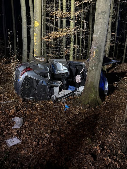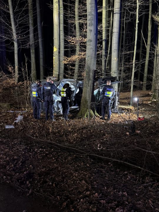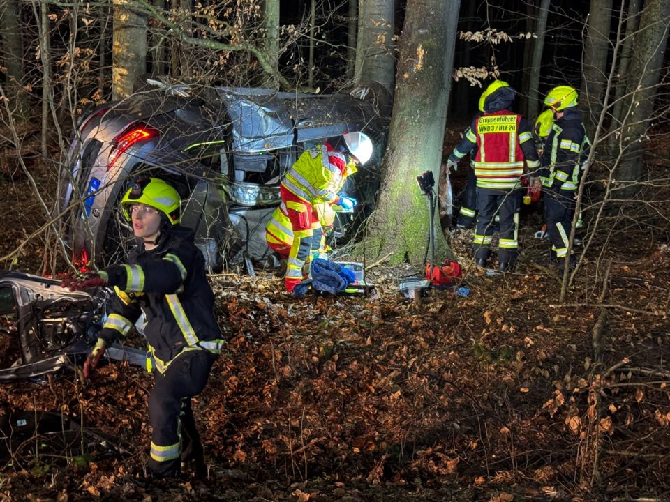 Die Beamten stellten kurz darauf fest, dass der Wagen in einer langen Rechtskurve nach links von der Fahrbahn abgekommen und gegen zwei Bäume geprallt war. Das Auto blieb schwer deformiert auf der rechten Fahrzeugseite liegen.