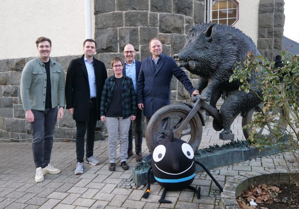 von links nach rechts: Thomas Nienhaus (Koordinierungsstelle Westfalen-Lippe, Zukunftsnetz), Manuel Wüst (Fachbereichsleiter Ordnung und Bürgerbüro), Corinna Buro (Mobilitätsmanagerin Stadt Netphen), Dr. André Wolf (Koordinierungsstelle Westfalen-Lippe, Zukunftsnetz), Marco Müller (Bürgermeister).