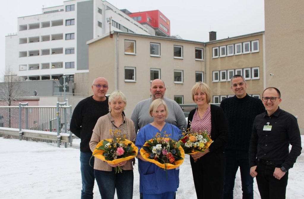 Seit 40 Jahren sind (vorne, von links) Anke Feuring, Pia Solbach und Sabine Büdenbender Teil des Diakonie Klinikums. Zu diesem Dienstjubiläum gratulierten Pflegedirektor Jörg Engel (2. von rechts), die Pflegedienstleiter Frank Grümbel (2. von links) und Wadim Linde (rechts) sowie MAV-Vorsitzender Marius Janeczek.