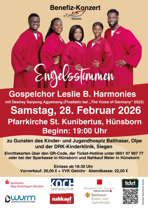 Nach dem Erfolg im Jahr 2024 in Hünsborn, wurde der Gospelchor Leslie B. Harmonies erneut für den Dienst an der guten Sache engagiert. Der Erlös kommt zu gleichen Teilen dem Kinder- und Jugendhospiz Balthasar und der DRK-Kinderklinik Siegen zugute.