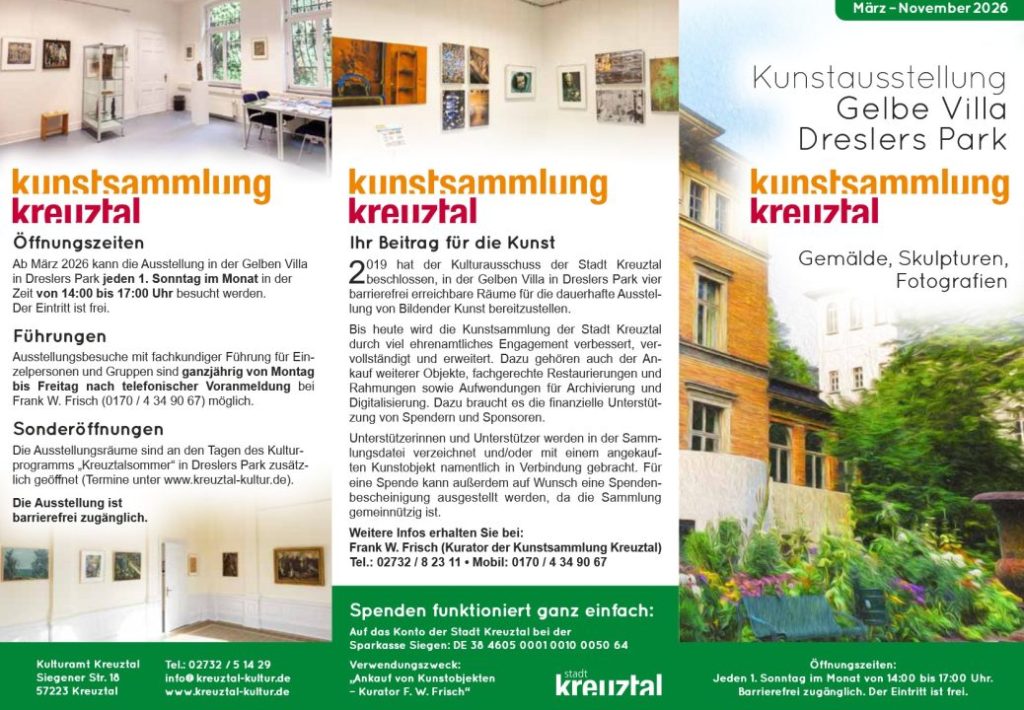 Seit Bereitstellung von repräsentativen Ausstellungsräumen in der historischen Gelben Villa in Dreslers Park im Jahr 2020 besteht dauerhaft die Möglichkeit, im zeitlichen und thematischen Wechsel Teile der Kreuztaler Kunstsammlung der Öffentlichkeit zu präsentieren. Die Jahresausstellungen werden von Frank W. Frisch, der sich mit großem ehrenamtlichen Engagement um die Kunstsammlung bemüht, kuratiert und zeigen jedes Jahr aufs Neue, wie vielseitig die heimische Kunstszene ist. Frisch steht üblicherweise an den Öffnungstagen der Ausstellung für Fragen zu den ausgestellten Werken bereit und kann so mit viel wertvollem Hintergrundwissen Zugang zur präsentierten Kunst schaffen. Ein Besuch lohnt sich also auch unbedingt für „Kunstneulinge“.