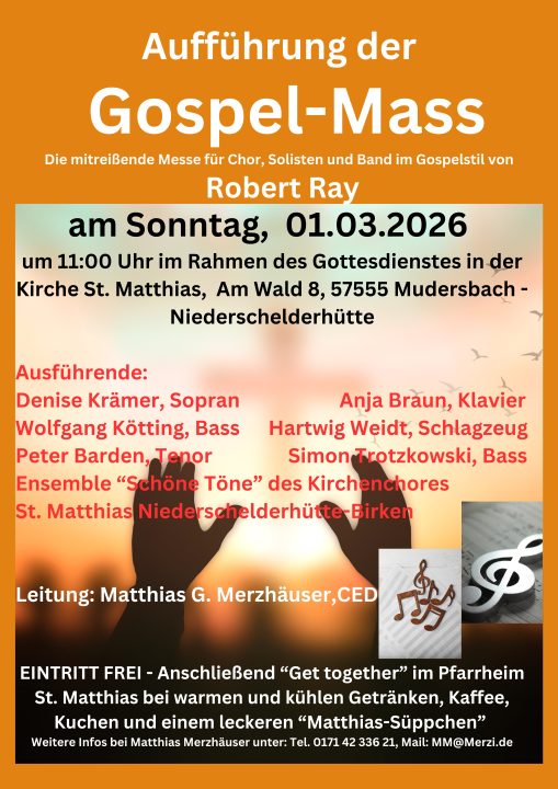 (wS/mm) Mudersbach-Niederschelderhütte 19.02.2026 | Die weltbekannte „GOSPEL-MASS“ des US-amerikanischen Komponisten Robert Ray (1946–2022) wird erneut in der Kirche St. Matthias, Am Wald 8, 57555 Mudersbach, aufgeführt. Anlass ist der Festgottesdienst zum Patronatsfest der Kirchengemeinde, der um 11:00 Uhr beginnt.