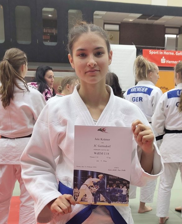 Jule Krämer vom Judo-Club Gernsdorf kämpft 2026 ihr erstes Jahr in der Altersklasse U18. Im U15-Bereich war Jule sehr erfolgreich und holte 2024 den Vizetitel bei den Westdeutschen Meisterschaften in Dormagen. Nun in der U18 hatte sich Jule mit einem ersten Platz bei der Bezirksmeisterschaft in Kamen für die Westdeutsche Meisterschaft qualifiziert. Dort besiegte Jule in Runde 1 die Hildenerin Liv Gerlach. In Runde 2 ging es dann gegen die Erstplatzierte des Bezirks Detmold, Viktoria Derr aus Rheda. Auch hier setzte sich Jule vorzeitig durch. Danach folgte der Kampf um den Einzug ins Finale gegen die Erstplatzierte des Bezirks Düsseldorf. Hier unterlag Jule, und auch das kleine Finale um Platz 3 gegen die Bezirksmeisterin aus Köln, Xenia Grummer, ging leider verloren. Somit bleibt ein toller 5. Platz in der Gewichtsklasse −52 kg. Damit war Jule Krämer die einzige Athletin aus Südwestfalen, die sich für die Deutschen Meisterschaften in Leipzig qualifizieren konnte. Diese finden am 1. März statt und sind natürlich das bisherige Highlight in der Wettkampfkarriere von Jule Krämer sowie ein toller Erfolg für die Nachwuchsarbeit des JC Gernsdorf.