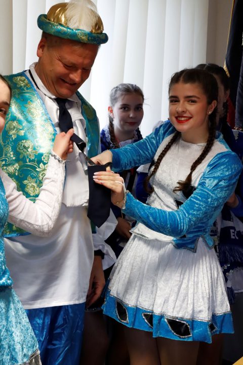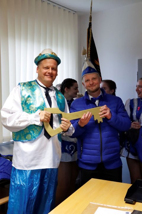 Bereits in den frühen Mittagsstunden zeichnete sich auch in diesem Jahr ab, dass dieser Tag kein gewöhnlicher Diensttag am Standort Erndtebrück werden würde. Mit geballter Kraft und bunten Kostümen rückten die Jecken des ECC in die Kaserne ein und erstürmten das Stabsgebäude. Ziel der Begierde: der goldene Schlüssel und das vorübergehende Kommando über den „Berg“.