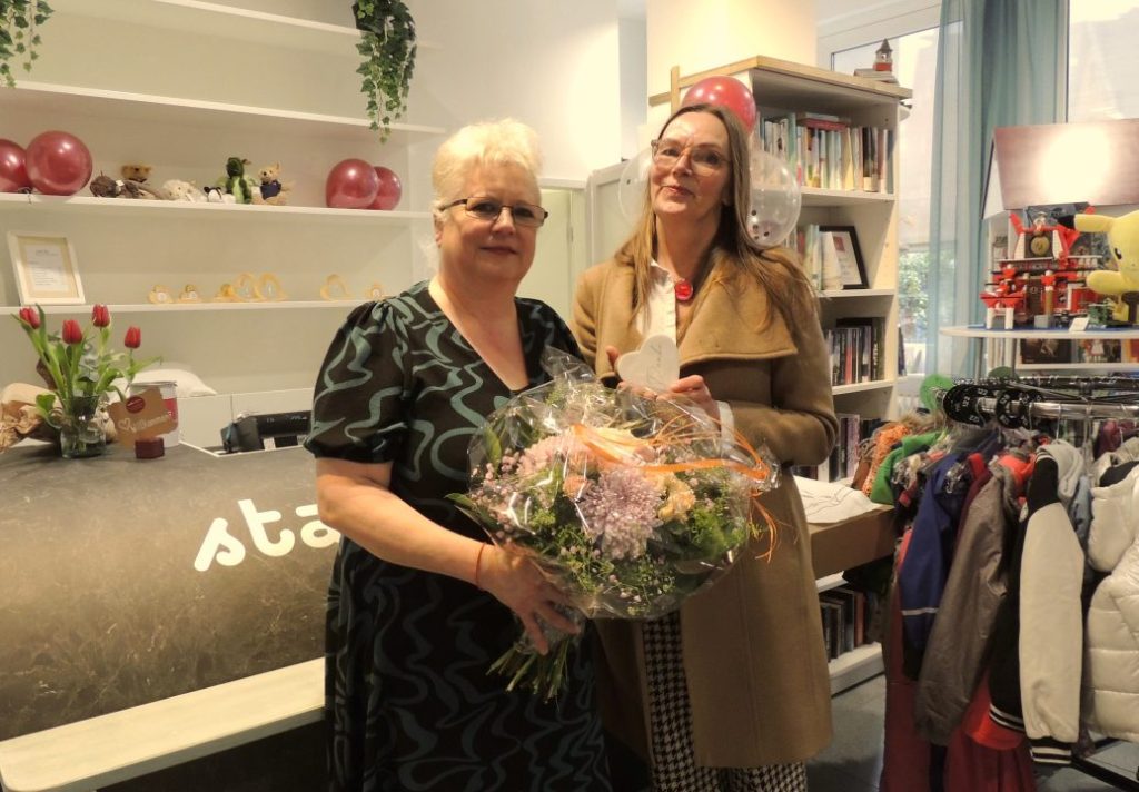 Zur Eröffnung ein bunter Strauß – so erfrischend wie die „stadtschätze“ – überreicht von Geschäftsführerin der Alternative Lebensräume GmbH Sonja Becker (rechts) an die Verkaufsleiterin Astrid Brockelt von AliBaba