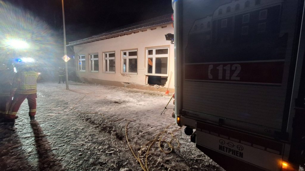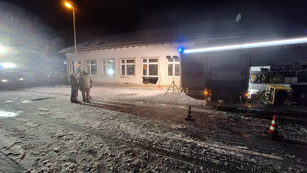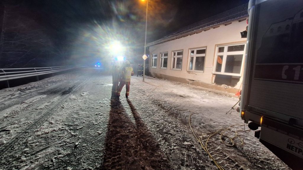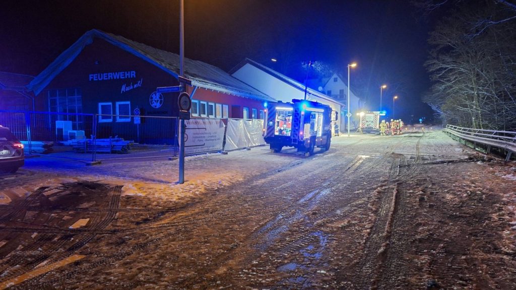 Nachdem der LKW die Außenwand des Bürgerhauses stark beschädigt hatte, kam es am Abend des 15.02.2026 zu einem Einsatz des Technischen Hilfswerks in Netphen-Eschenbach. Die Feuerwehr Netphen forderte zunächst einen Baufachberater des THW an. Die Begutachtung ergab, dass kurzfristig Sicherungsmaßnahmen am Gebäude notwendig waren. Daraufhin wurden die 2. Bergungsgruppe sowie der Zugtrupp des Technischen Zuges nachalarmiert. Der Einsatz dauerte bei dichtem Schneetreiben bis weit nach Mitternacht.