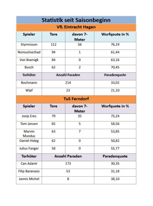 Das Pascal Bochmann im Hagener Kasten im letzten Spiel 23 Paraden hatte, sollte nicht weiter beunruhigen, solche „Ausrutscher“ gibt es immer wieder mal, hat ja auch etwas mit der Wurfqualität des Gegners zu tun, zudem stellt Ferndorf die bessere Abwehr. Can Adanir hatte im Spiel gegen Coburg auch 20 Paraden, es ist also nichts unmöglich.