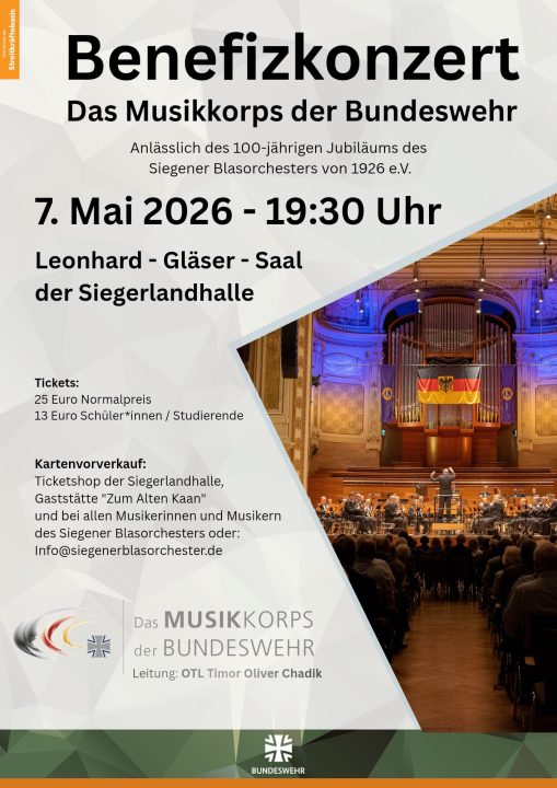 (wS/sb) Siegen 16.03.2026 | Das Siegener Blasorchester von 1926 e.V. feiert ein ganzes Jahrhundert Musikgeschichte – und beschenkt sich und sein Publikum mit einem besonderen Highlight: Am 7. Mai 2026 gastiert das renommierte Musikkorps der Bundeswehr im Leonhard-Gläser-Saal der Siegerlandhalle.