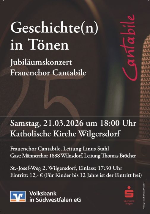 Das Jubiläumskonzert findet am Samstag, 21. März 2026, um 18:00 Uhr in der Katholischen Kirche in Wilgersdorf (St.-Josef-Weg 2) statt; Einlass für die Besucherinnen und Besucher ist bereits ab 17:30 Uhr.