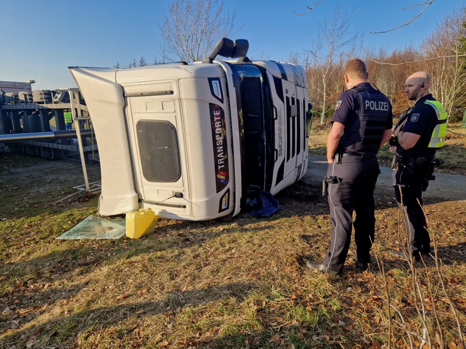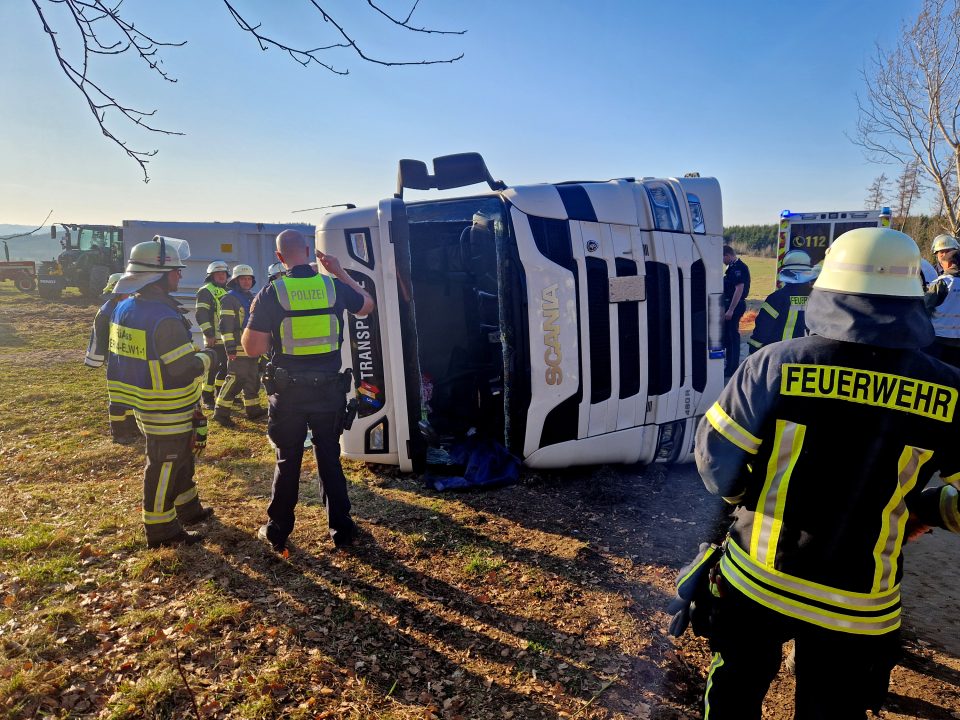 Die Einsatzkräfte fanden einen auf die Seite gekippten Muldenkipper vor, in dessen Führerhaus sich ein schwer verletzter Fahrer befand. Entgegen der ersten Meldung war der Mann nicht eingeklemmt, sondern im Führerhaus eingeschlossen und nicht in der Lage, sich selbst zu befreien.