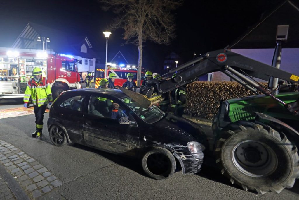Angenommen wurde ein schwerer Verkehrsunfall im Bereich der Dorfstraße nahe der Kirche: Ein Traktor war mit seiner Frontgabel frontal in einen Pkw gefahren, in dem zwei Personen eingeklemmt wurden. Ziel der Übung war es, die technische Rettung möglichst realitätsnah zu trainieren.
