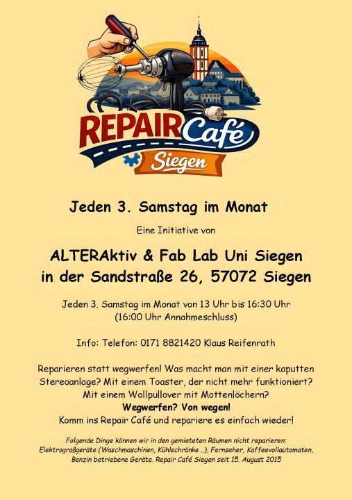 (wS/kr) Siegen 13.03.2026 | In einer Zeit, in der Nachhaltigkeit und Umweltschutz immer mehr an Bedeutung gewinnen, setzen ALTERAktiv und das Fab Lab der Universität Siegen ein deutliches Zeichen gegen den Konsumwahn. Am Samstag, den 21. März 2026, öffnen sich von 13:00 bis 16:30 Uhr (Annahmeschluss 16:00 Uhr) wieder die Türen für das beliebte Repair Café in der Sandstraße 26.