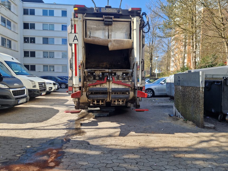 Der Vorfall ereignete sich während der regulären Müllabfuhr. Als der Hecklader des Entsorgungsfahrzeugs die Tonnen leerte und den Abfall im Inneren presste, hielt der illegal entsorgte Kunststoffkanister dem massiven Druck nicht stand. Das auslaufende Öl ergoss sich aus dem Presswerk direkt auf die Fahrbahn. Da das Fahrzeug seine Route zunächst fortsetzte, zog sich eine Ölspur über die Straße bis hin zu einem Anwohnerparkplatz.