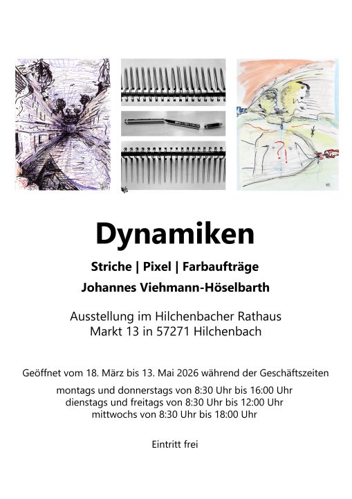 (wS/red) Hilchenbach 07.03.2026 | Kunst kann Bewegung sichtbar machen – nicht nur im Motiv, sondern auch im Gefühl der Betrachtenden. Genau diesem Spannungsfeld widmet sich der Kreuztaler Künstler Johannes Viehmann-Höselbarth in seiner Ausstellung „Dynamiken: Striche | Pixel | Farbaufträge“, die vom 18. März bis 13. Mai 2026 im Hilchenbacher Rathaus zu sehen ist.