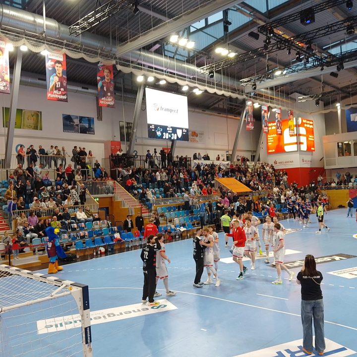 Was jetzt folgte, war die erste Führung für Potsdam durch ein Siebenmetertor in der 45. Minute. Potsdam war dran, das Spiel hatte schon jetzt für beide Teams viel Kraft gekostet, doch alle bissen sich durch. Verlieren, nein, das wollte keiner und so haben die 22:22, 23:23, 24:24 25:25 und auch das 26:26 in der 51. Minute gezeigt, dass jetzt der Ritt auf der Rasierklinge folgen würde. Ferndorf hatte ein gute Abwehrleistung, war sehr beweglich, trieb die Gastgeber jetzt aber oft ins Zeitspiel, aber Potsdam hielt natürlich dagegen. Und zwar mit ihrem 27:26 und dem 28:26, sollte da doch noch was gehen (?), die Tribüne kam wieder, die, die eigentlich komplett unter Ferndorfer Herrschaft stand, denn die fackelten ein Feuerwerk ab, das war schon richtig Klasse. Jetzt kamen aber auch die Nerven ins Spiel, Viana zum 28:27, Fehlwurf Mundus, Fehler Potsdam und Tor Finn Scharnweber , es stand 29:29. Ein kleiner Thriller zum Schluss, die Adler verwandeln einen Siebenmeter (30:29), technischer Fehler Ferndorf, den nächsten Wurf wehrt Can Adanir ab, aber es hätte eigentlich Zeitspiel gepfiffen werden müssen (!?). Jetzt stellt Ceven Klatt auf sieben gegen sechs und „Jugo“ um und Marvin schafft es wirklich, das harzige Spielgerät zum 30:30 einzutüten. Noch 4 Sekunden für Potsdam, aber die zu verplanen ist ja Wahnsinn, so blieb es denn auch beim wohlverdienten Remis. Ohne Cans Parade wäre ein Remis nicht möglich gewesen, Danke Can.