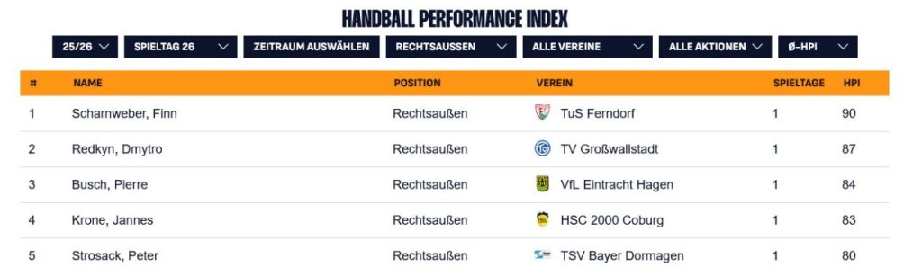 - Da Finn Scharnweber 8 Tore ohne Fehlwurf erzielte, hat er die 100 % Trefferquote erreicht, zudem liegt er mit seinem HPI-Wert auf Platz 1 des Spieltages bei den Rechtsaußenspielern
