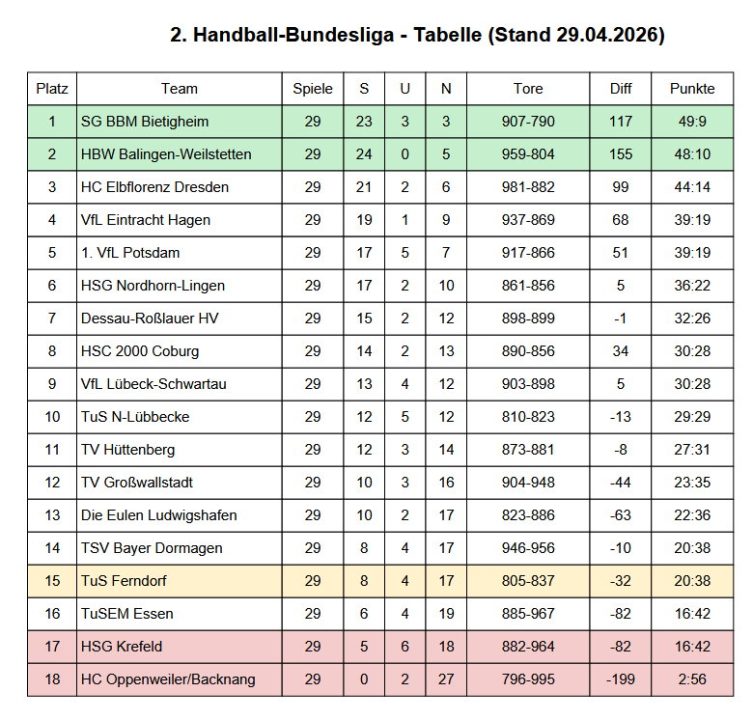 Meine „Laienmeinung“ dazu, ich denke, dass der 2. Absteiger zwischen den punktgleichen HSG Krefeld und TuSEM Essen entschieden wird. Ferndorf liegt 4 Punkte hinter diesen beiden und bin mir sicher, dass wir es schaffen. Interessant wird der jetzige Spieltag durch die Tatsache, dass alle obengenannten Mannschaften Auswärtsspiele haben. (Siehe beigefügte Tabelle der letzten 5 Spiele)