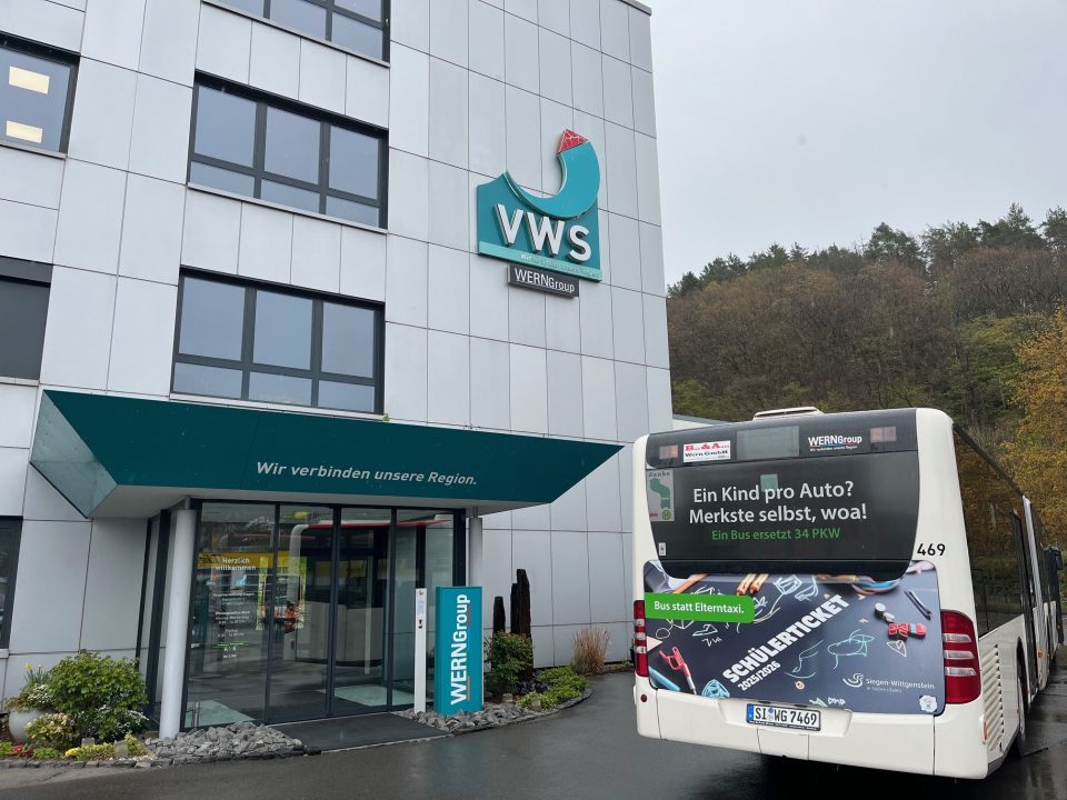 Ein Linienbus der VWS wirbt im Kreis Siegen-Wittgenstein für das SchülerTicket und klimafreundliche Mobilität im Schulverkehr. Foto: VWS