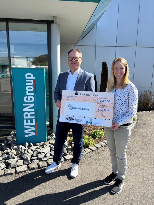 (wS/vws) Siegen 17.04.2026 | Erneut setzt die WERNGroup ein deutliches Zeichen gesellschaftlicher Verantwortung: Vor der Hauptverwaltung der VWS Verkehrsbetriebe Westfalen-Süd in Siegen überreichte Geschäftsführer Jörg Mühlhaus einen Spendenscheck über 3.000 Euro an Julia Jüngst, Sprecherin der Mukoviszidose-Regionalgruppe Siegen.