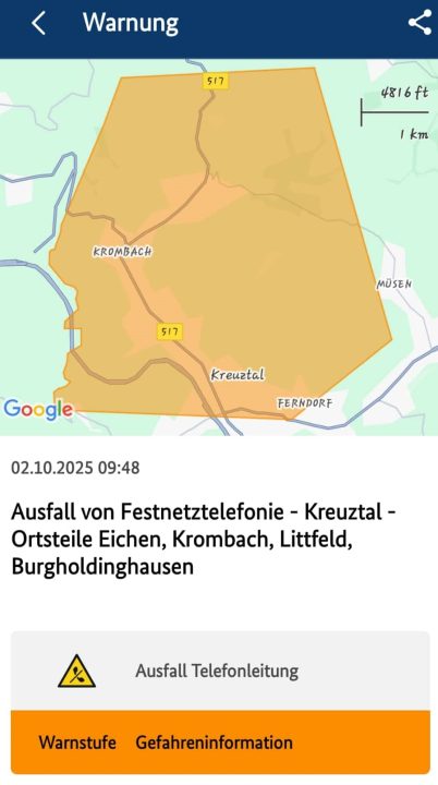 (wS/red) Kreuztal – 02.10.2025 | Aktuell besteht in den Ortschaften des Littfetals (Eichen, Krombach, Littfeld, Burgholdinghausen) eine Störung der Festnetztelefonie, so dass – insbesondere für Hilfeersuchen/Notrufe – Mobiltelefone genutzt werden müssen. Bitte informieren und unterstützen Sie Ihre Nachbarn und Angehörige, insbesondere Nutzer von Hausnotrufsystemen oder anderen automatischen Gefahrenmeldeanlagen, so dass parallel ein Notruf über Mobiltelefone angesetzt werden kann.