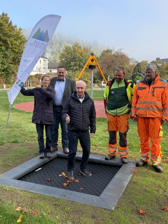 Bad Laasphes Bürgermeister Dirk Terlinden stellte die städtische Fläche zur Verfügung und testet das Trampolin bei der Eröffnung gleich selbst. Sein Fazit: „Das Spielgerät ergänzt optimal die bestehenden Angebote im Sinne des Mehrgenerationenspielplatzes und wird vielen kleinen und großen Bürgerinnen und Bürgern Freude bereiten.“