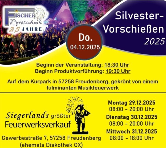 (wS/red) Freudenberg 03.12.2025 | Auch in diesem Jahr lädt Fischer Pyrotechnik zu einem besonderen Höhepunkt der Vorweihnachtszeit ein: Am Donnerstag, 4. Dezember 2025,...