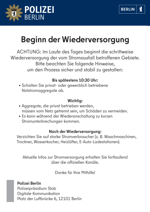7. Januar 2026(wS/pb) Berlin 07.01.2026 | In Berlin-Südwesten entspannt sich die Lage nach dem mehrtägigen Stromausfall in Steglitz-Zehlendorf aktuell deutlich. Seit heute, dem 7. Januar...